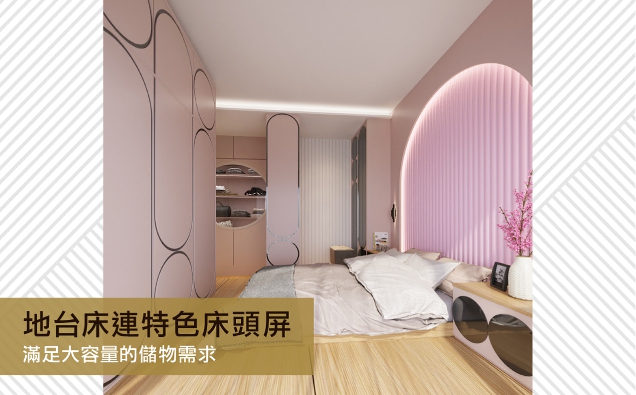 主人房的地台床加入圓拱形床頭屏,每晚如置身於異地遊歷,儲物地台床和全高身衣櫃無縫接合,滿足大容量儲物需求