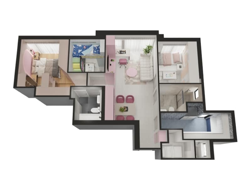 現代家居風格,客廳及主人房均以大熱「AL教主」粉紅色為主調,並以線條與幾何圖形貫徹廳房,每一件多功能傢俬如藝術品般細緻