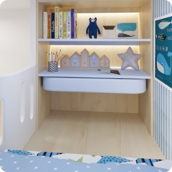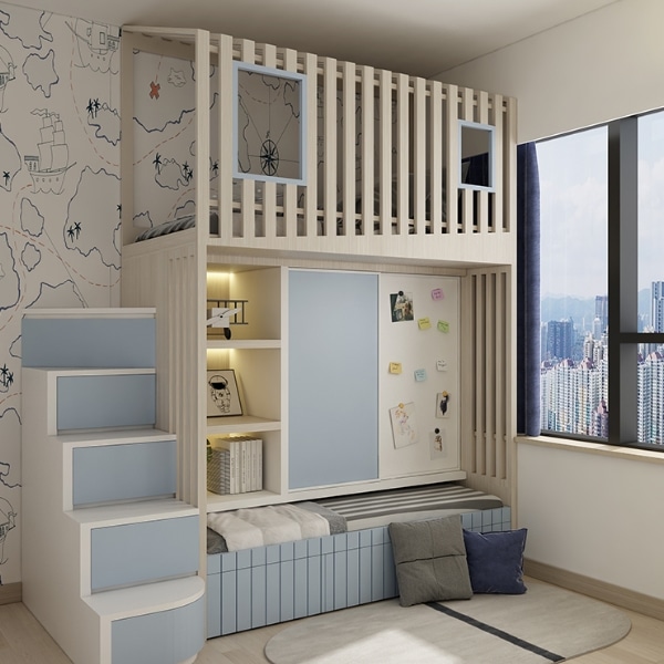籬笆高架床設計趣味性十足,配合儲物式樓梯櫃,將收納空間提升。底層梯級以圓角設計以減低撞傷機會