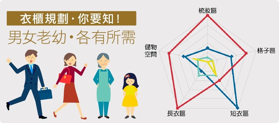 女士天生愛美,通常都會擁有多不勝數的衣服、手袋、配飾及美妝用品等等。如果要對同住男女的衣櫃進行分區,最好男女有各自的儲衣空間,女性的比例可以大一點。由於女性衣物款式多變,長短不一,因此長掛衣區及短掛衣區加層板間隔的搭配是比較理想。此外,可考慮加入格子梳妝櫃桶,既可整齊擺放首飾等小物品,掀開檯面便可成為小小梳妝間,一物二用、一舉兩得。